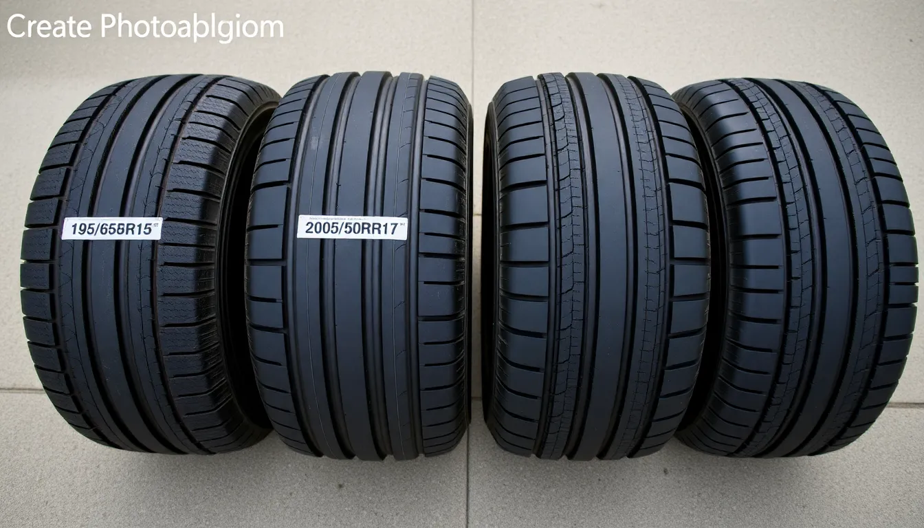 Tire size specifications follow a format like P195/65R15. The first number (195) indicates width in millimeters, the second number (65) is the aspect ratio (sidewall height as a percentage of width), R means radial construction, and the last number (15) is the rim diameter in inches. Additional numbers and letters indicate load index and speed rating.