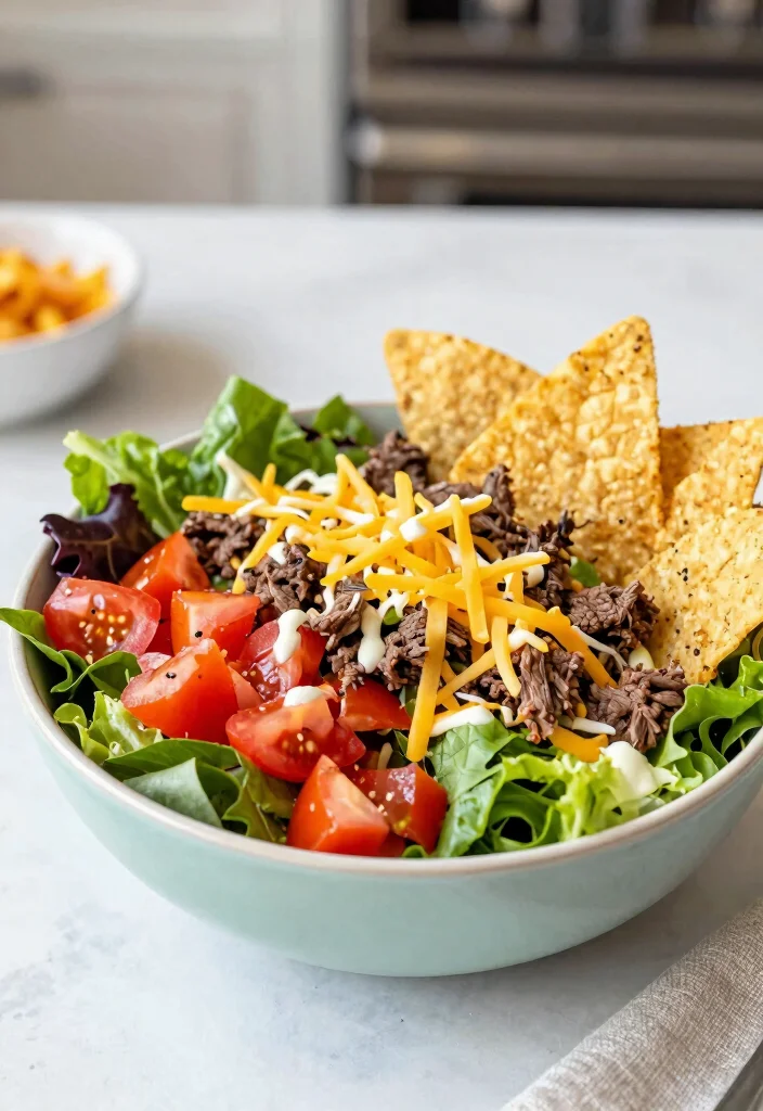For a lighter twist on classic tacos, try this beef taco salad! It’s a fun and healthy way to enjoy all the flavors of tacos without the carbs. Loaded with seasoned ground beef, fresh veggies, cheese, and crunchy tortilla chips, this salad is a satisfying meal. It’s perfect for warm days when you want something refreshing yet filling!
