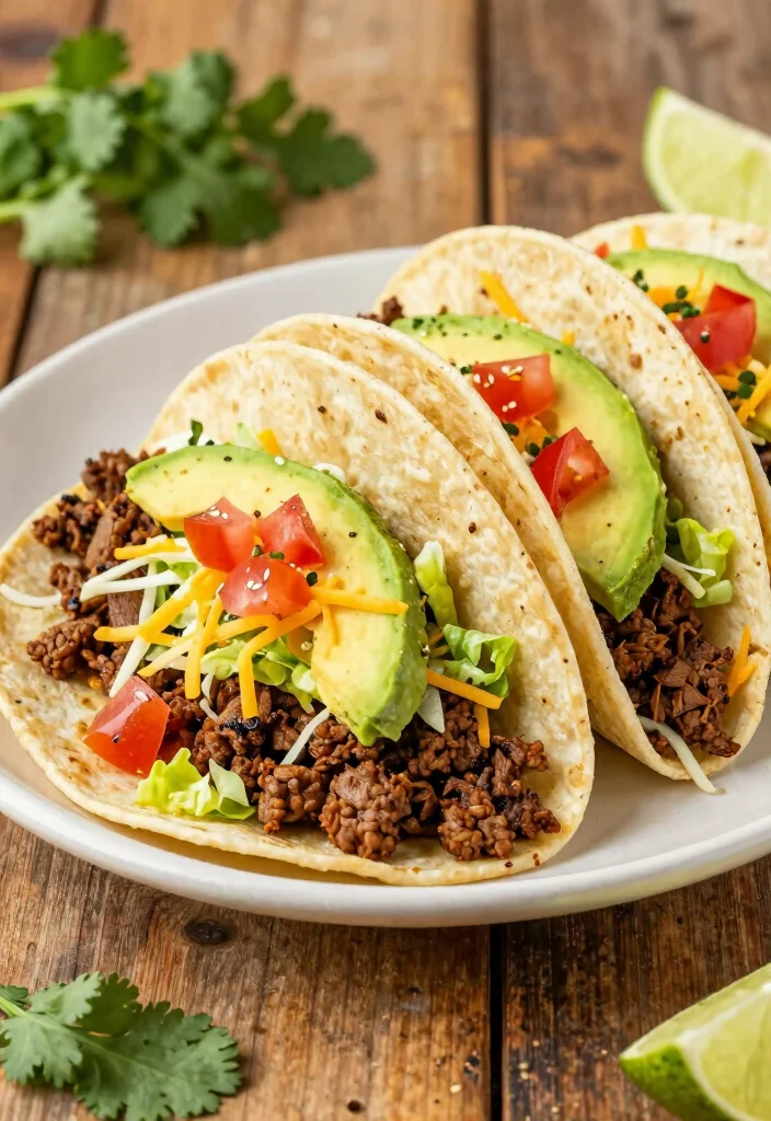Ingredients: – 1 lb ground beef – 1 can black beans, drained – 8 corn tortillas – 1 tsp cumin – 1 lime, juiced – Cilantro and avocado for topping