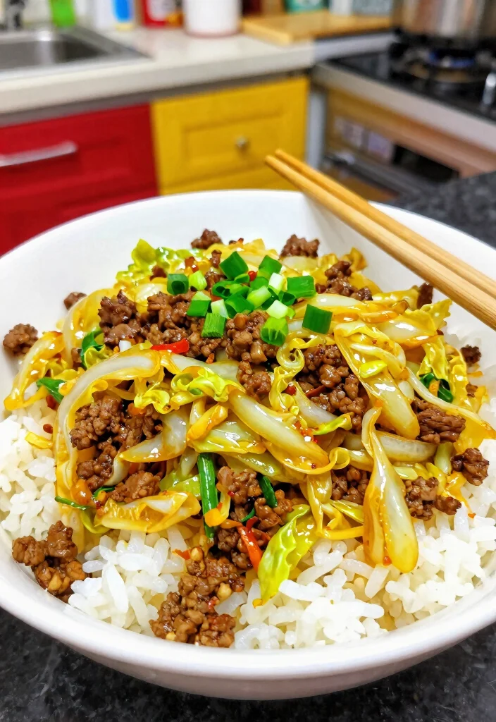 Instructions: 1. In a skillet, heat sesame oil over medium heat. 2. Brown ground beef, then drain excess fat. 3. Add onions and garlic, cooking until soft. 4. Stir in cabbage and soy sauce. Cook until cabbage is tender. 5. Serve warm over rice or noodles.