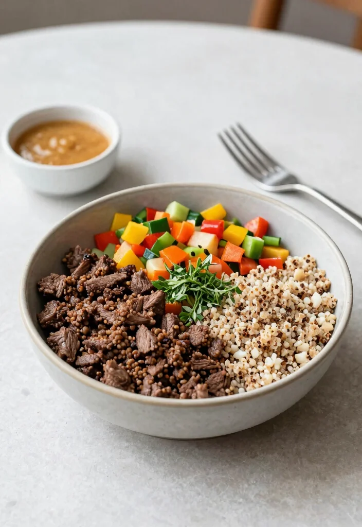 Looking for a nutritious meal that’s easy to prepare? This beef and quinoa bowl is the answer! Ground beef is cooked with spices and served over a bed of fluffy quinoa, topped with fresh veggies and a drizzle of sauce. Quinoa is not only a great source of protein but also gluten-free, making this bowl a healthful option for everyone.