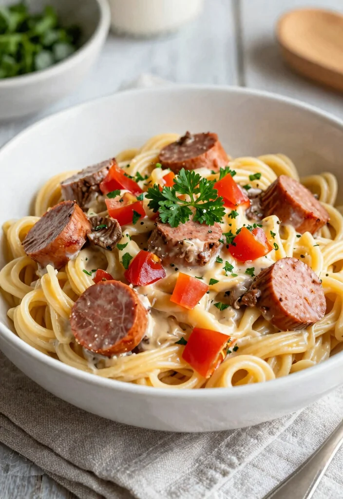 Whip up a hearty beef sausage pasta that’s bursting with flavor! This dish combines creamy pasta and savory beef sausage, making it a comforting meal for any night. The ground beef is cooked with hearty Italian sausage and tossed with penne pasta and a rich tomato sauce, creating a satisfying dish that’s sure to please the whole family.