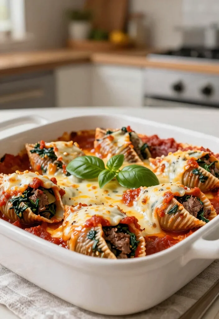 Instructions: 1. Preheat oven to 375°F. Cook pasta according to package instructions. 2. In a skillet, brown ground beef. Drain excess fat. 3. Mix in ricotta cheese and spinach. 4. Stuff each shell with beef mixture, place in a baking dish, and cover with marinara sauce and mozzarella. 5. Bake for 25 minutes until cheese is bubbly.