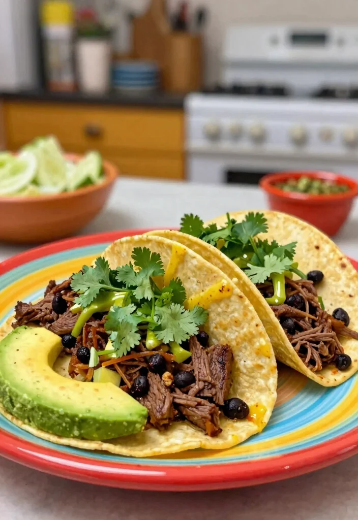 Instructions: 1. In a skillet, brown ground beef until fully cooked. Drain excess fat. 2. Stir in black beans and cumin, cooking until heated through. 3. Warm tortillas in a separate pan. 4. Fill each tortilla with beef and bean mixture, garnishing with cilantro and avocado. 5. Serve with lime wedges on the side.