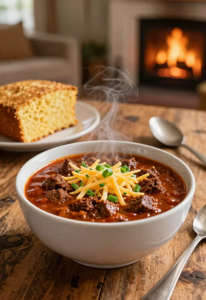 FAQs: – Can I use turkey instead of beef? Yes, it’s a great healthier alternative! – What’s a good side dish? Cornbread or a simple salad complements chili well.