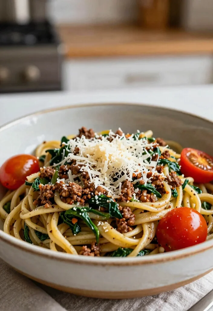 Weeknights don’t have to be a scramble—this ground beef and spinach pasta is proof that quick ground beef recipes can be easy, one-pan meals. In under 30 minutes you get protein, greens, and flavor, with a quick Parmesan finish to elevate it.